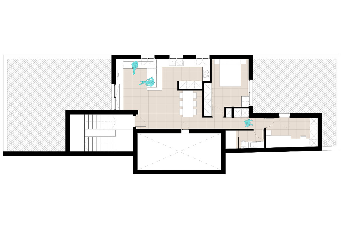 La propuesta genera un espacio abierto, polivalente y que gozará de luz natural, que funciona como la zona de día. La posición de la cocina se integra en este espacio generando los recorridos interiores, la textura de madera de las carpinterías dialoga con el resto de texturas nobles como la cerámica que aparece en fachada y que se mantendrá como elemento diferencial e histórico. La luz perimetral oculta refuerza la sensación de calidez y las texturas de los materiales. Las nuevas texturas, el pavimento de hormigón y un tabique sin revestimiento, siguen potenciando la materialidad de una manera sutil.